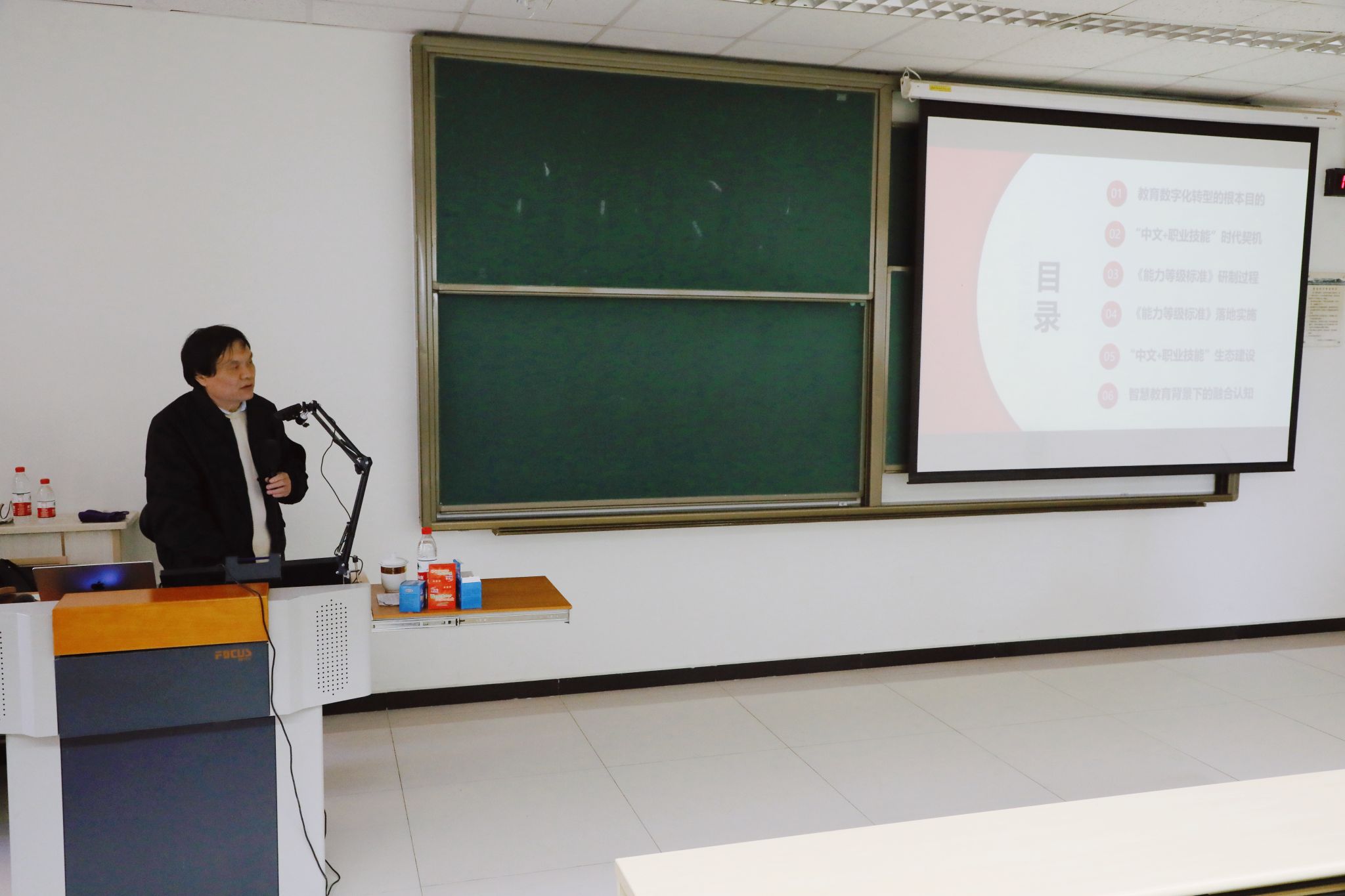 2023年11月30日下午,应用中文学院在教三楼200教室举办科研讲座。本次讲座特邀北京师范大学宋继华教授做了题为“教育数字化转型与‘中文+职业技能’生态体系建设”的专题讲座。讲座由应用中文学院刘长征教授主持。