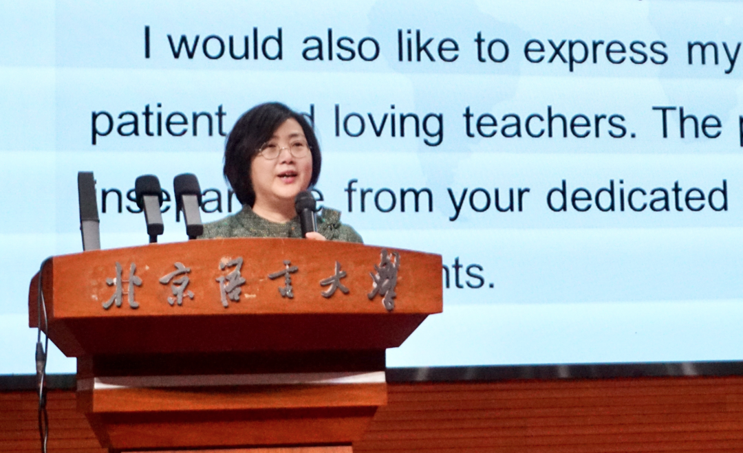 在结业典礼上,苏英霞院长首先为本学期做了总结发言,鼓励留学生们将所学知识运用到实际生活中,为促进中外文化交流和推动世界和平与发展贡献力量,并给同学们送上了美好的祝福。