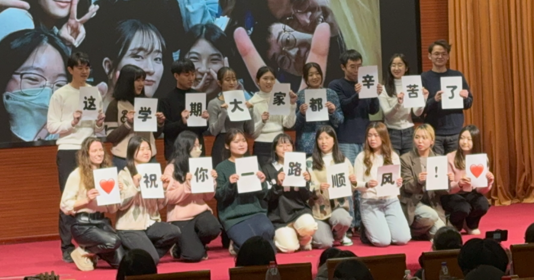 接下来教师代表蔡楠老师、学生代表德莉塔和尹河研也做了本学期的总结汇报,强调了学习、友情和生活等方面的重要收获。