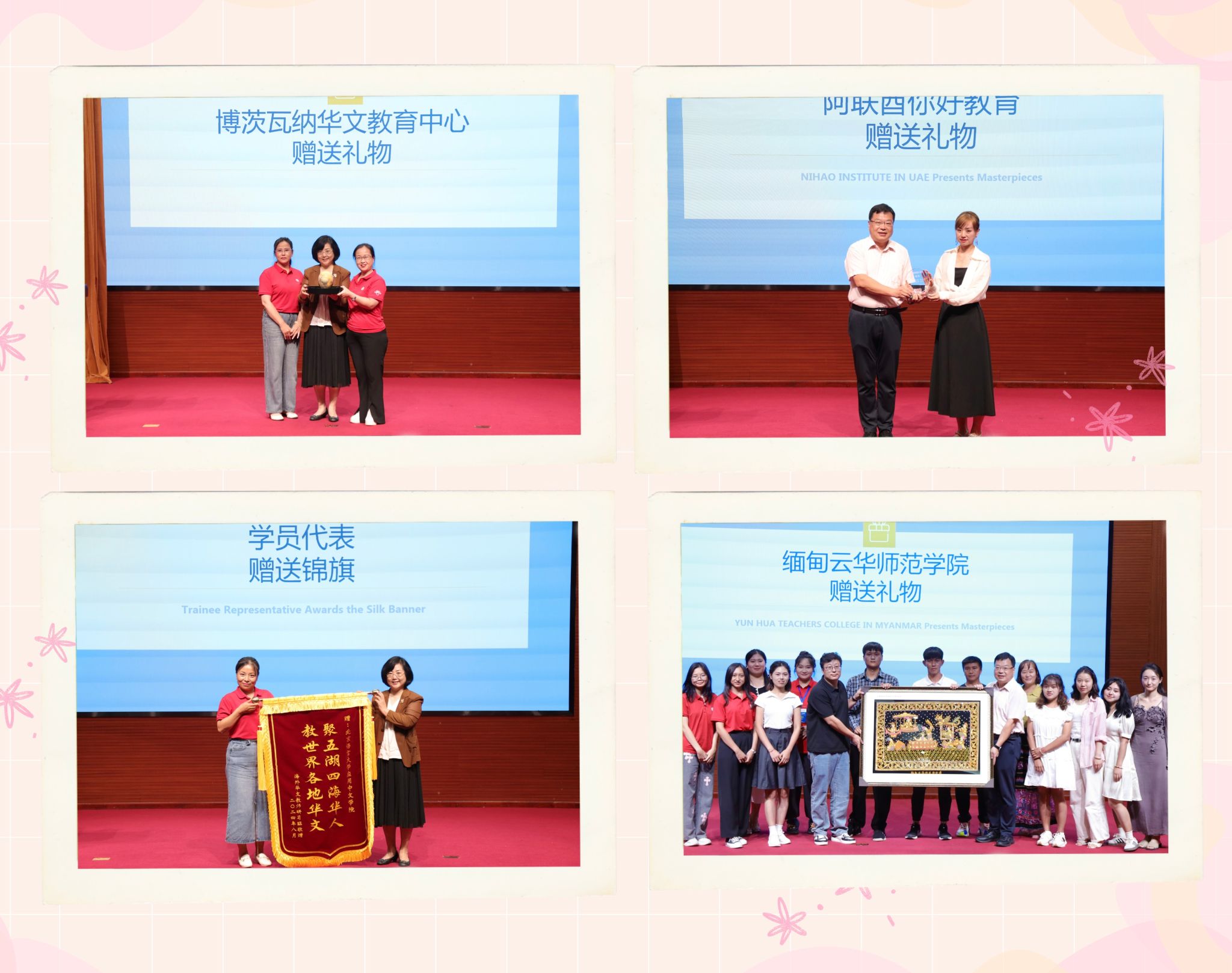 缅甸云华师范学院、博茨瓦纳华文教育中心、阿联酋“你好教育”以及全体学员分别向北京语言大学中华文化国际传播中心和应用中文学院赠送锦旗和礼物,对中心和学院搭建的平台、提供的优质课程表达了衷心的感谢。