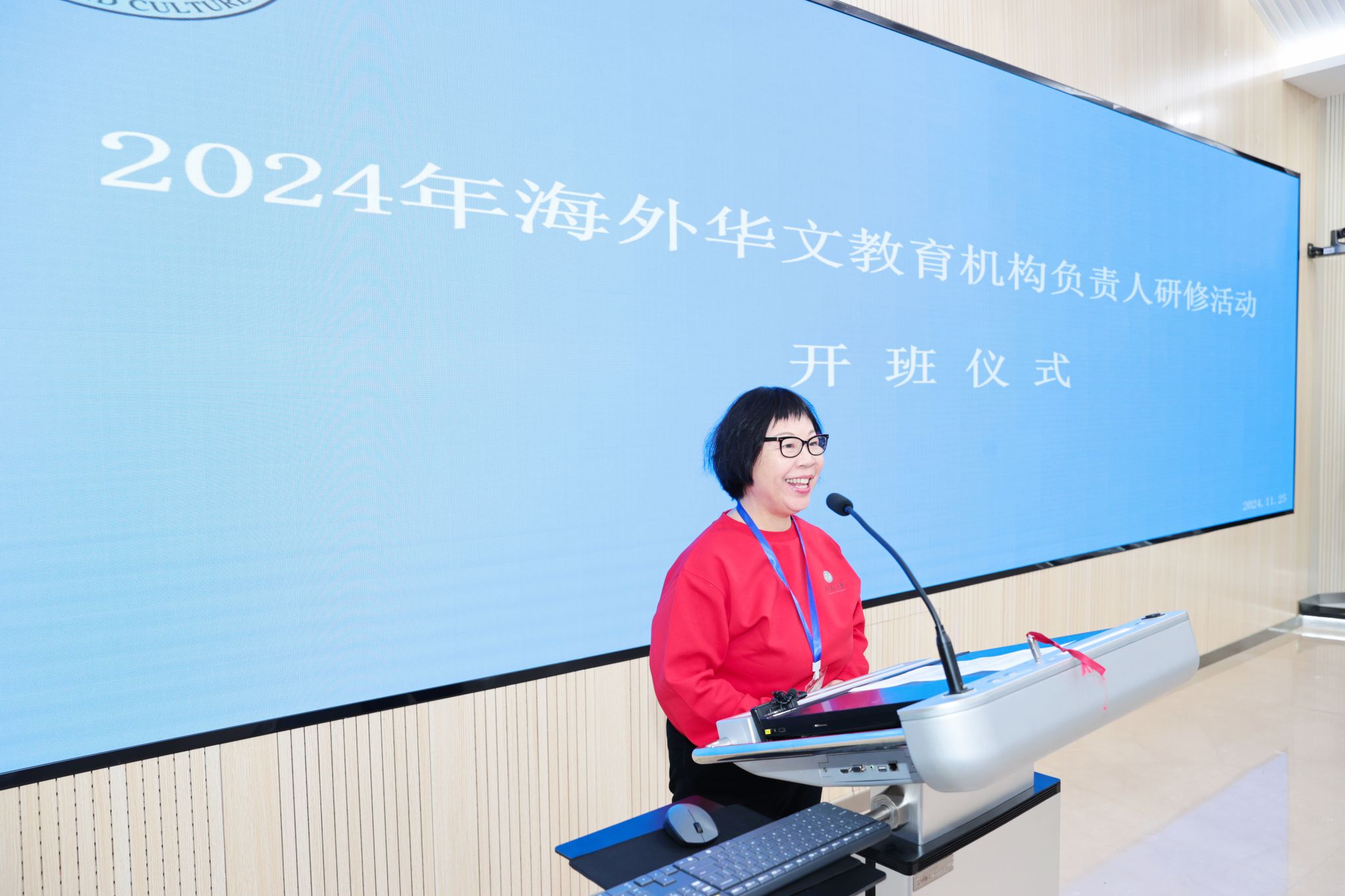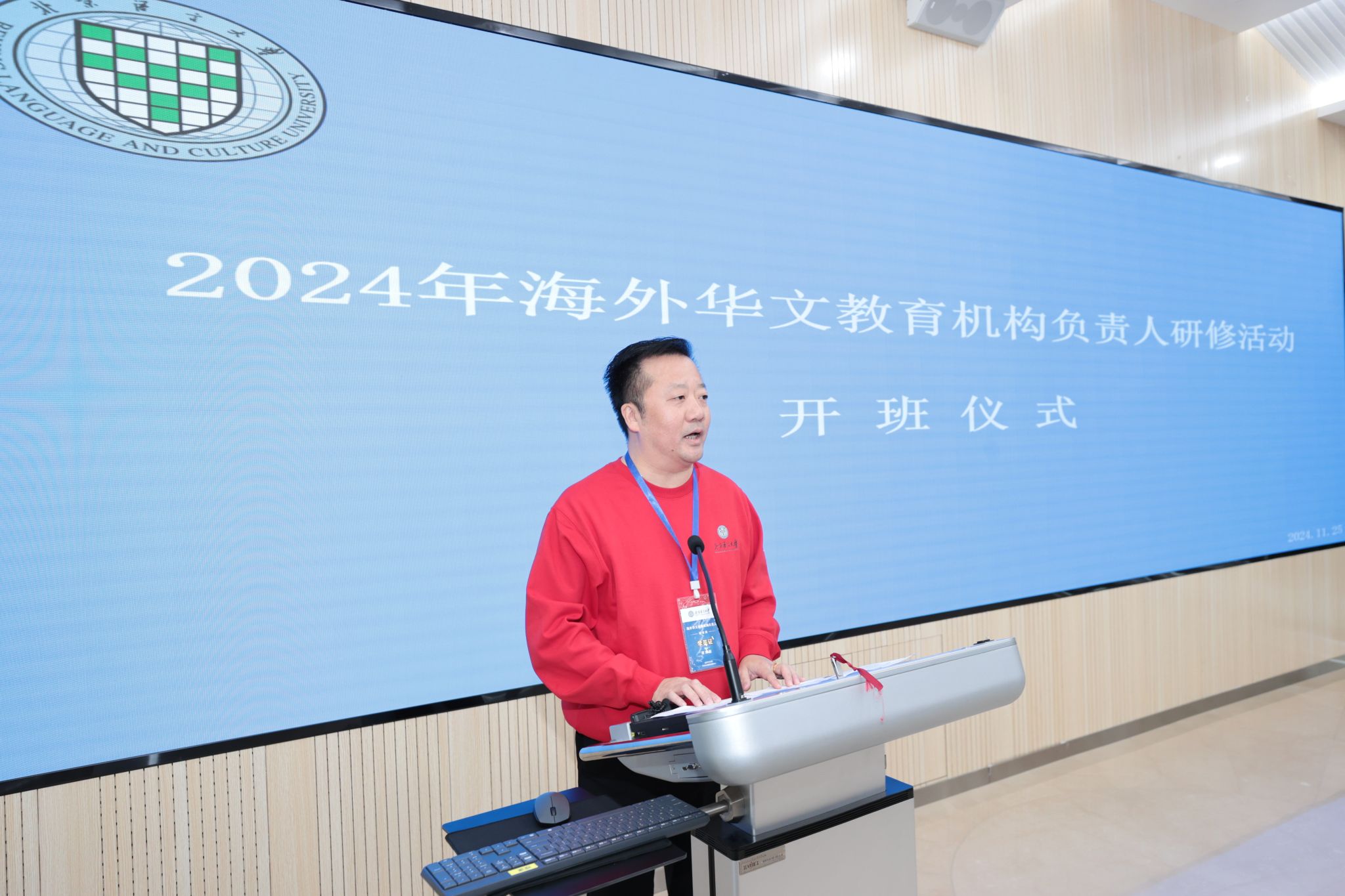 11月25日,由北京市人民政府侨务办公室主办,北京语言大学应用中文学院和中华文化国际传播中心联合承办的2024年海外华文机构负责人研修活动隆重开班。市侨办二级巡视员马东、侨务事务处处长林婕、侨务事务处副处长李峰、北京语言大学副校长黄益方、应用中文学院院长、中华文化国际传播中心主任苏英霞、应用中文学院院务委员会主任周鑫等领导嘉宾出席,来自全球17个国家的36位海外华文机构负责人参加了开班式。开班式由北京语言大学党外知识分子联谊会常务副会长吕静主持。
