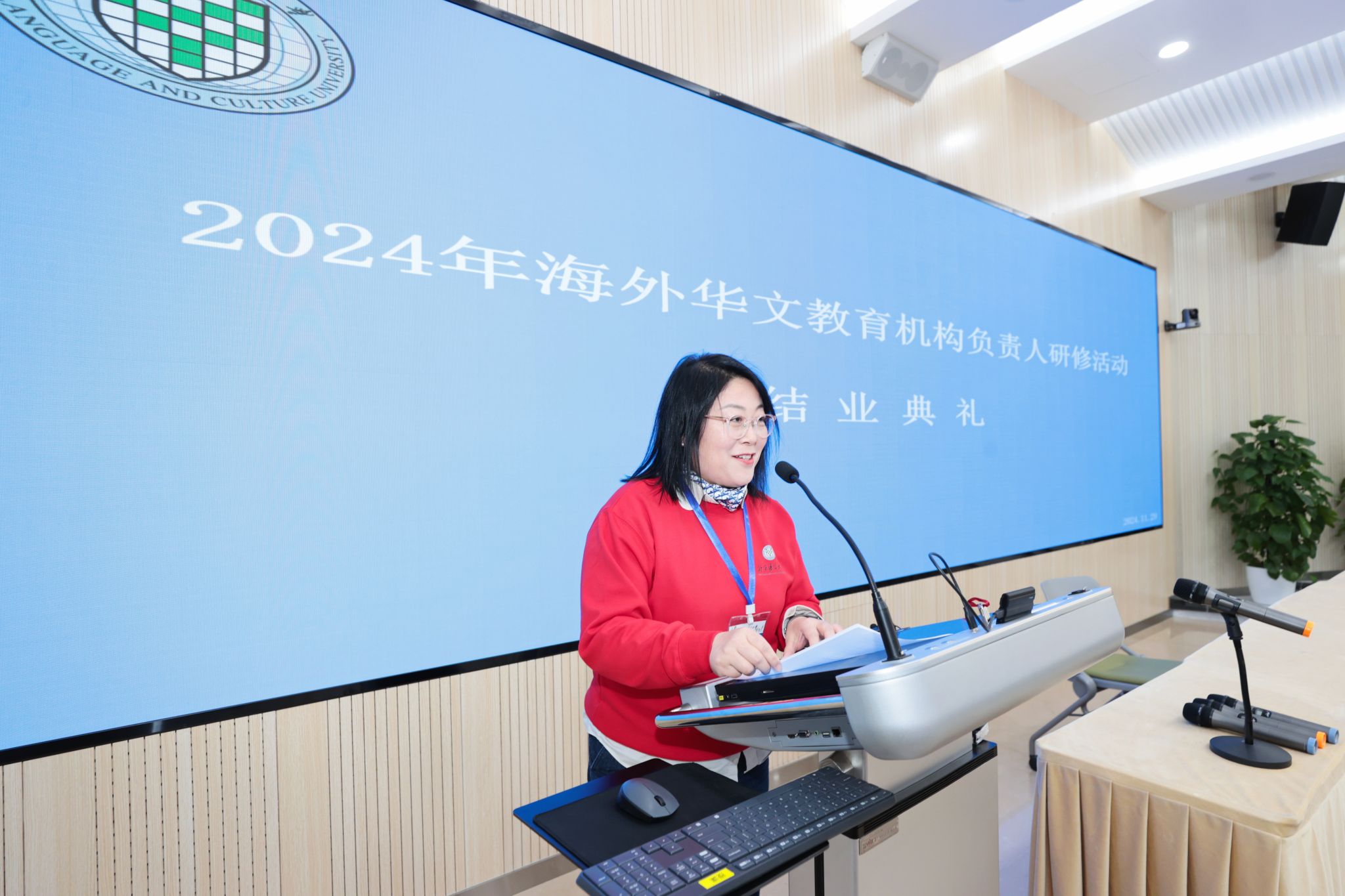 北京语言大学应用中文学院院长苏英霞教授在讲话中,对各位学员圆满完成研修活动表示祝贺,对市侨办的指导和信任表示感谢。苏院长表示,本次海外华文教育机构负责人研修活动是北语应用中文学院和中华文化国际传播中心承办的重要项目,旨在为大家更好地开展华文教育工作提供切实的帮助。希望借此契机,与海外华文学校在教师培养、教学和教材编写等领域开展更广泛的合作。
