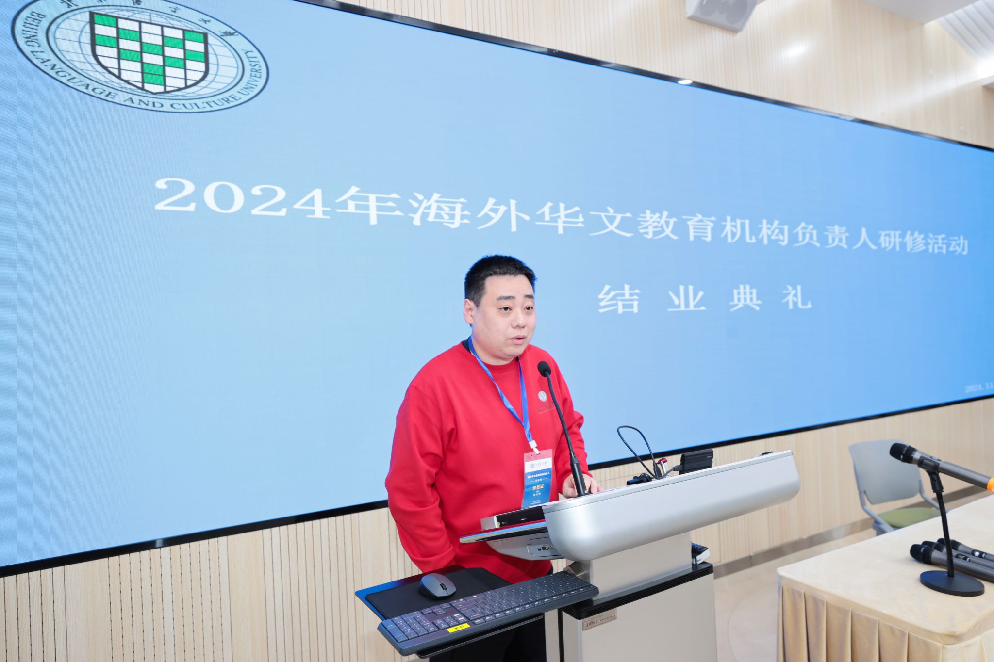 澳大利亚墨尔本新金山西区中文学校校长沈大为作为学员代表发言。他讲到,本次活动安排紧凑而充实,不仅让全体学员深入学习了中国文化与教育的发展动态,也让大家对国际中文教育的未来发展有了更深刻的理解和展望。在收获知识与经验的同时,也深刻认识到肩上的使命与责任。未来教学必将主动引入先进技术,探索更多元化的模式,全力推动中文教育与当地文化的有机融合。希望能与全球华教同仁保持密切联系,凝心聚力共同推动中文教育蓬勃发展,为中华文化的全球传播贡献绵薄之力。