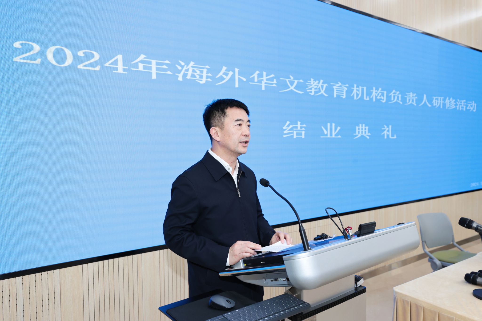 北京市侨办二级巡视员马东作总结讲话,代表市侨办向全体学员的积极参与和北京语言大学的辛勤付出表示感谢。他指出,当今国际形势复杂,华文教育事业任重道远。一是要加强交流互鉴,相互保持联络;二是要注重创新发展,在继承传统华文教育的基础上,敢于创新运用现代化科技手段提升华文教学的趣味性和有效性,吸引更多人参与到学习中来;三是要注重培养专业化的教师队伍,让华文教育后继有人;四是要加强与国内的合作,欢迎学员们多回国学习交流“充电”。他表示,全体学员要把此次研修活动中获得的知识和启发,转化为推动海外华文教育创新发展的实际行动,让海外华文教育这项“留根工程”不断打造出精品,把海外华文教育这项光荣的事业不断推向新高。