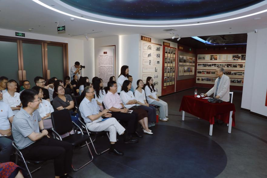 在大家的簇拥下,刘珣教授在校史馆模拟情景现场,饶有兴致地讲起他所亲历的北语建校发展的历史,生动再现了老一辈国际中文教师教育家们教书育人、爱岗敬业的生动故事。在报告中,刘珣教授从事业和学科的发展分期、教材编写、测试研制、教学理论与教学方法研究等方面回顾了学科初创时期的北语,带领老师们深入走进了那段峥嵘岁月。刘珣教授是我国对外汉语教育事业的重要奠基者之一、汉语作为第二语言教学学科体系的创建者之一。段鹏校长在今年的毕业典礼致辞中讲到,刘珣教授将自己的事业概括为“四件小事忙半生”,“一套教材、一份考卷、一本小书、一张课表”这四件小事奠定了汉语国际教育的学科基础,填补了早期教学研究空白。