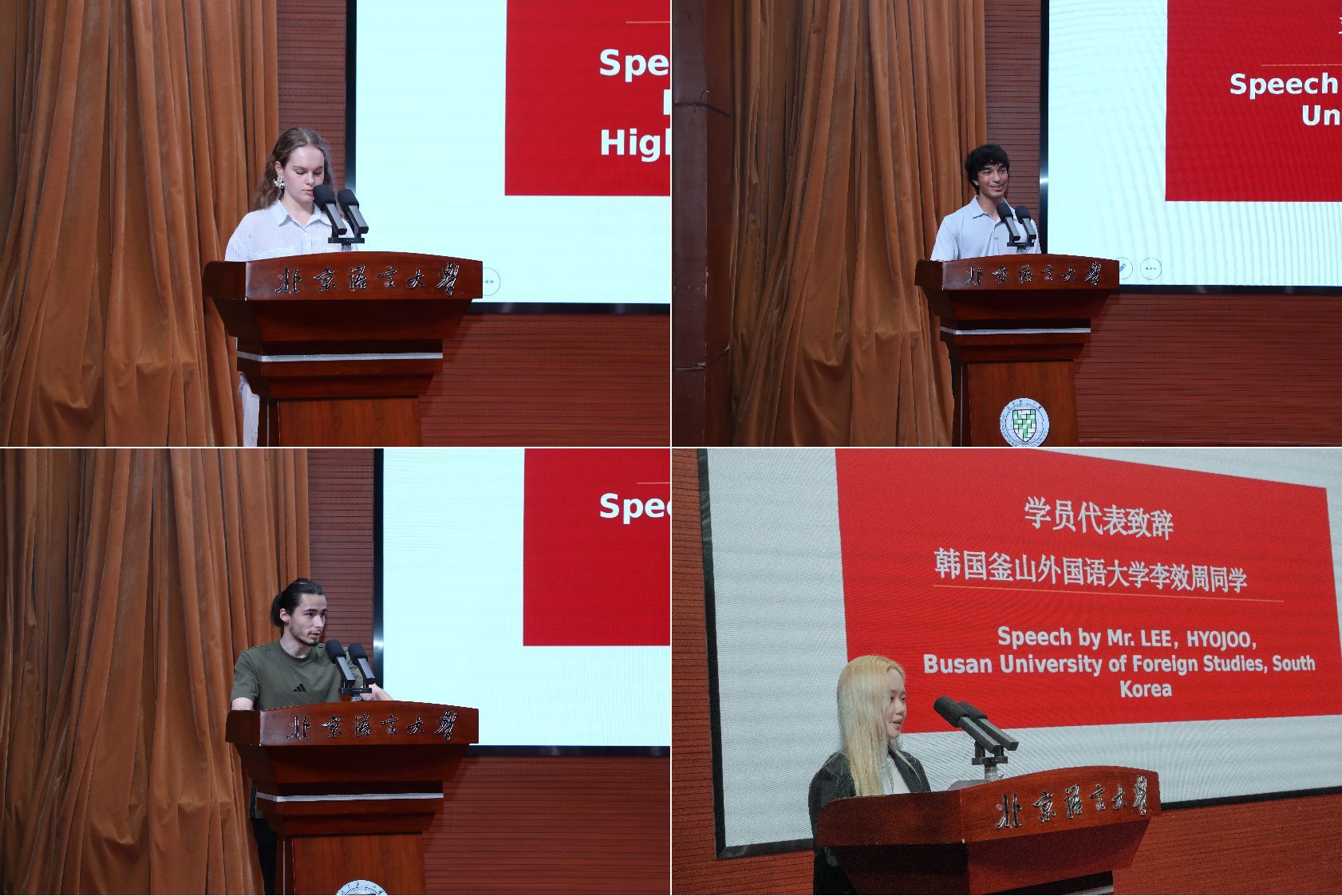 随后,法国洛林大学的瓦伦丁·莱尔(Valentin Lair)同学、美国华盛顿大学的王安(Rowan Anant Asgaonkar)同学、韩国釜山外国语大学的李效周(Hyojoo Lee)同学以及俄罗斯高等经济大学的苏子语(Sofia Serebriakova)同学作为学员代表先后上台交流发言。他们用中文分享了自己的体会和感想,对北京语言大学提供宝贵的学习机会和老师们的辛勤付出表达了衷心感谢!王安同学说“无论是经济、科技,还是城市建设,中国的发展变化都让人惊叹!作为中文学习者,非常幸运能在这个时代来到中国。”他说,通过学习不仅提高了中文水平,也更深入了解了中国人的生活方式和思维方式。瓦伦丁·莱尔同学表达了对未来学习的期待,表示会珍惜这个一生中难得的机会。李效周同学说,刚来到学校就已经体验到北语校园生活的多彩多姿,希望通过暑校学习经历,不仅提高汉语水平,也增强两国学生间的友谊和了解。苏子语同学说,对中国语言和文化都非常感兴趣,期待这次学习有更多的发现,回国后会更喜欢汉语和中国文化。