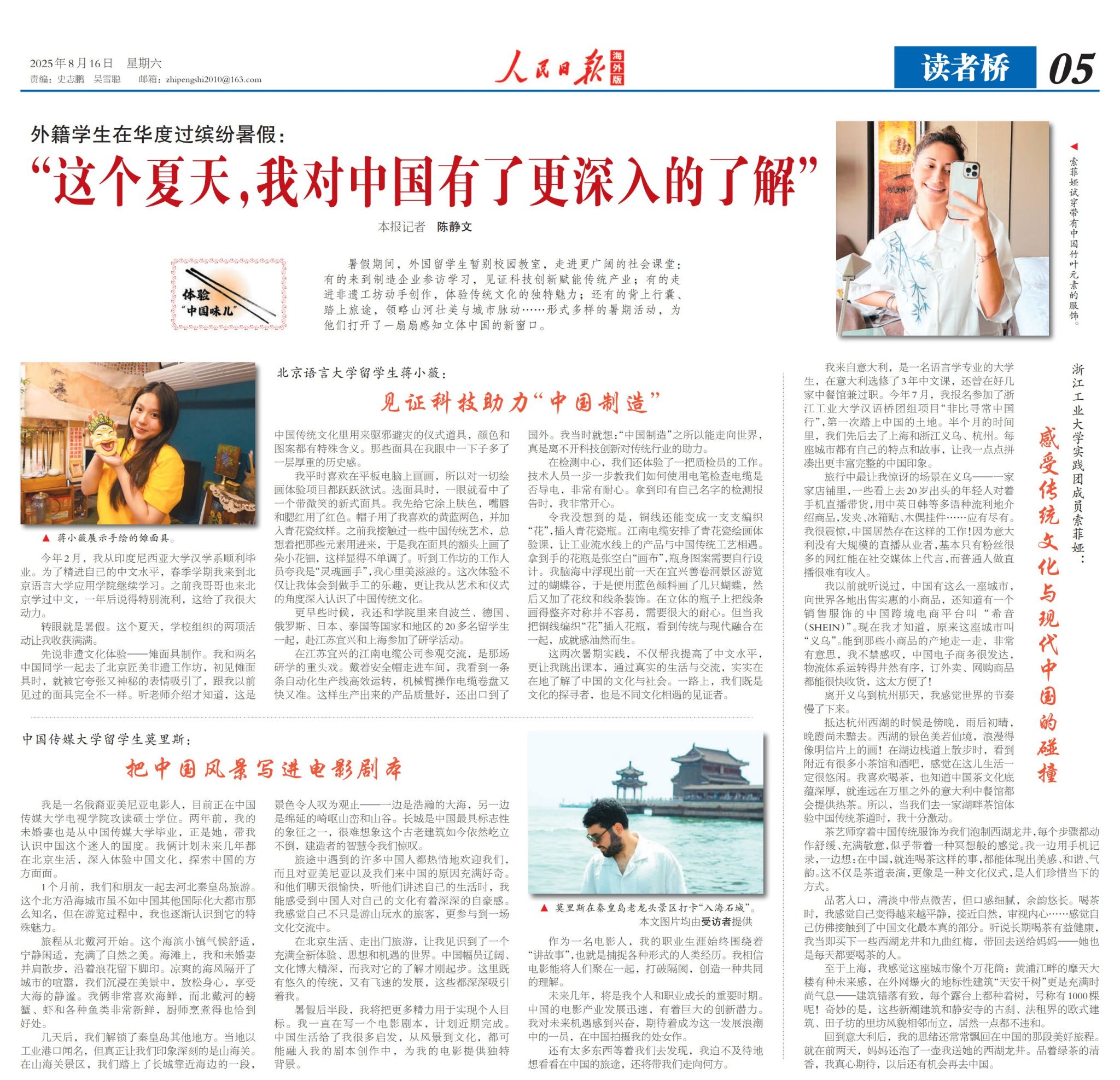 暑假期间,外国留学生暂别校园教室,走进更广阔的社会课堂:有的来到制造企业参访学习,见证科技创新赋能传统产业;有的走进非遗工坊动手创作,体验传统文化的独特魅力;还有的背上行囊、踏上旅途,领略山河壮美与城市脉动……形式多样的暑期活动,为他们打开了一扇扇感知立体中国的新窗口。