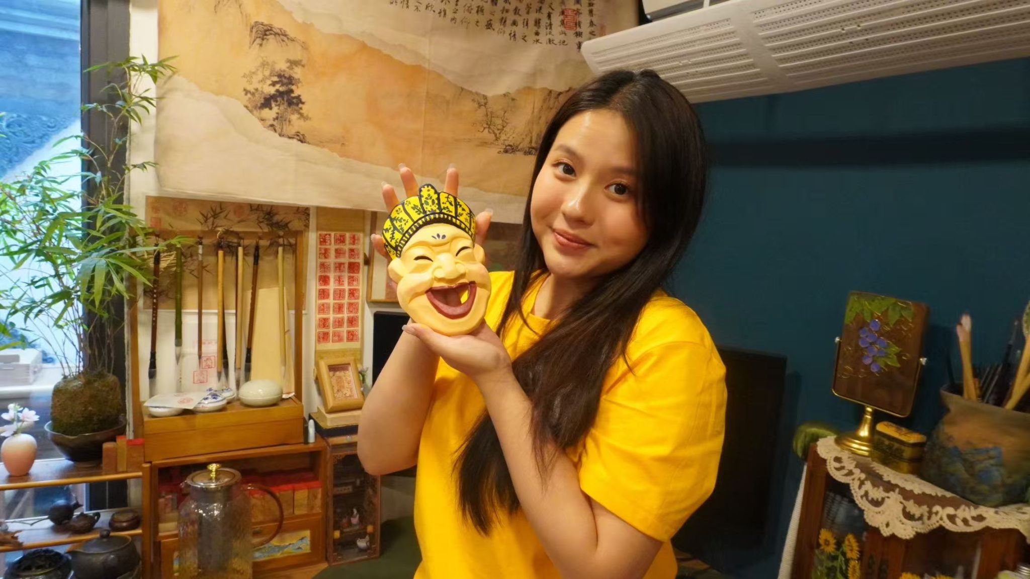 我平时喜欢在平板电脑上画画,所以对一切绘画体验项目都跃跃欲试。选面具时,一眼就看中了一个带微笑的新式面具。我先给它涂上肤色,嘴唇和腮红用了红色。帽子用了我喜欢的黄蓝两色,并加入青花瓷纹样。之前我接触过一些中国传统艺术,总想着把那些元素用进来,于是我在面具的额头上画了朵小花钿,这样显得不单调了。听到工作坊的工作人员夸我是“灵魂画手”,我心里美滋滋的。这次体验不仅让我体会到做手工的乐趣,更让我从艺术和仪式的角度深入认识了中国传统文化。