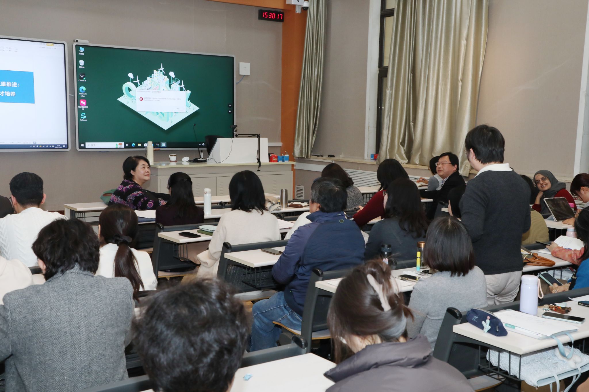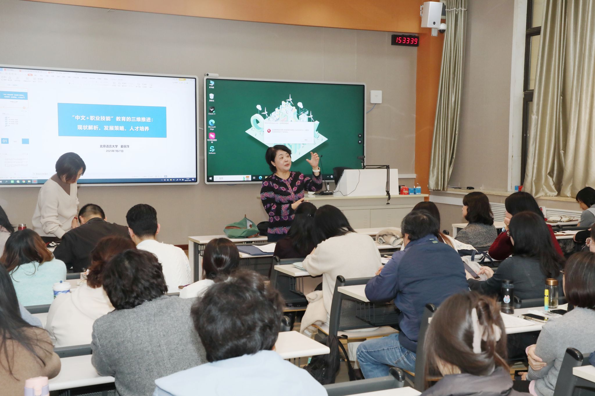 本系列讲座的第一讲特别邀请了世界汉语教学学会专门用途中文教育分委会主任委员、北京语言大学国际中文学院的姜丽萍教授作题为“‘中文+职业技能’教育的三维推进:现状解析、发展策略、人才培养”的专题报告。讲座由应用中文学院副院长朱文文主持,应用中文学院全体教师及研究生参加本次讲座。