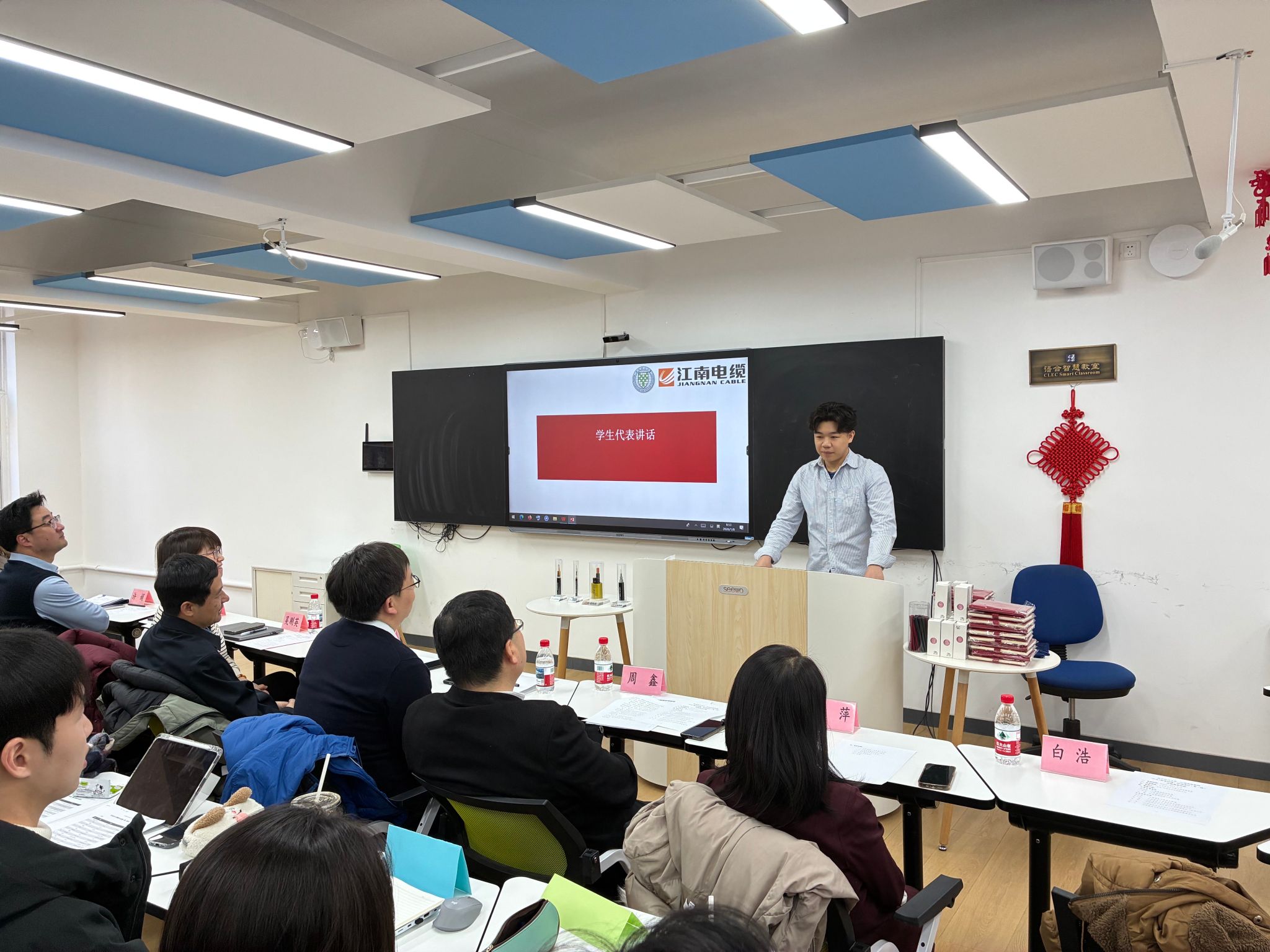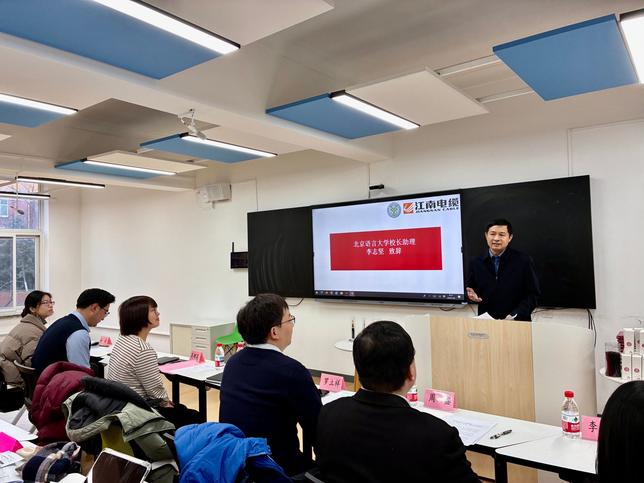 2026年1月8日上午,北京语言大学与江南电缆集团合作举办的“中文+职业技能”培训项目(第一期)开班典礼在我校教五楼智慧教室举行。校长助理李志坚,教育基金会秘书处秘书长罗立祥,应用中文学院党委书记周鑫、副院长李萍(主持工作)、党委副书记白浩,以及江南电缆集团副总经理吴刚英、丁作为,群团工作部经理许娟等出席典礼。典礼由白浩主持。