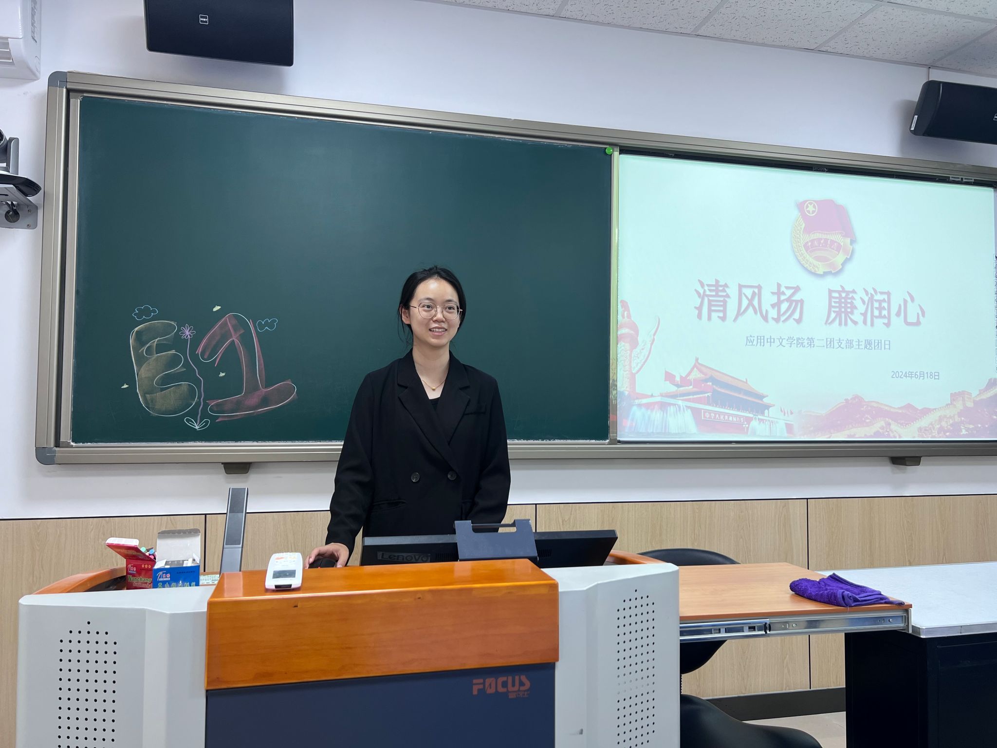为深入贯彻学校开展党纪学习教育部署要求,6月18日,应用中文学院第二团支部精心策划了一场以“清风扬,廉润心”为主题的线上线下结合团日活动。此次活动在团支书田晓妍同学的主持下顺利展开,学院党委副书记、团总支书记白浩和辅导员冷美雨老师亲临指导。本次活动旨在通过新颖的教育方式,深化全体师生对廉洁自律的认知,强化防腐拒变的思想根基。