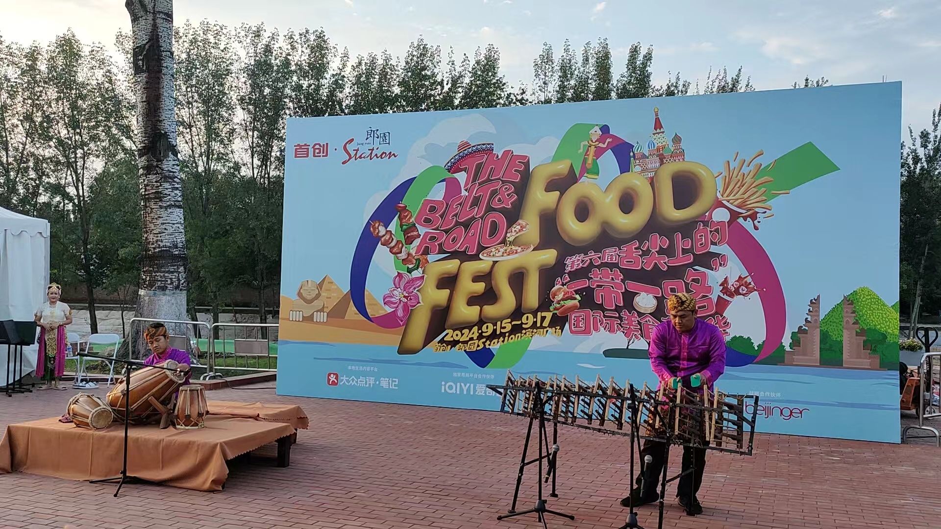 此外,美食节现场还穿插着多场精彩纷呈的音乐舞蹈表演。来自不同国家的艺术家们身着华服,用旋律与舞蹈讲述着各自的故事,展现了“一带一路”沿线国家多元而和谐的文化生态。特别值得一提的是,印尼的传统乐器Angklung在本次活动中大放异彩。印尼艺术家们用Angklung演奏出悠扬动听的旋律,与印尼的舞蹈表演交相辉映,为观众带来了一场视听上的双重享受。专题小组的成员们沉浸在这一场场视听盛宴中,纷纷表示这不仅是对艺术的享受,更是对“一带一路”倡议下文化交流与合作美好愿景的生动诠释。
