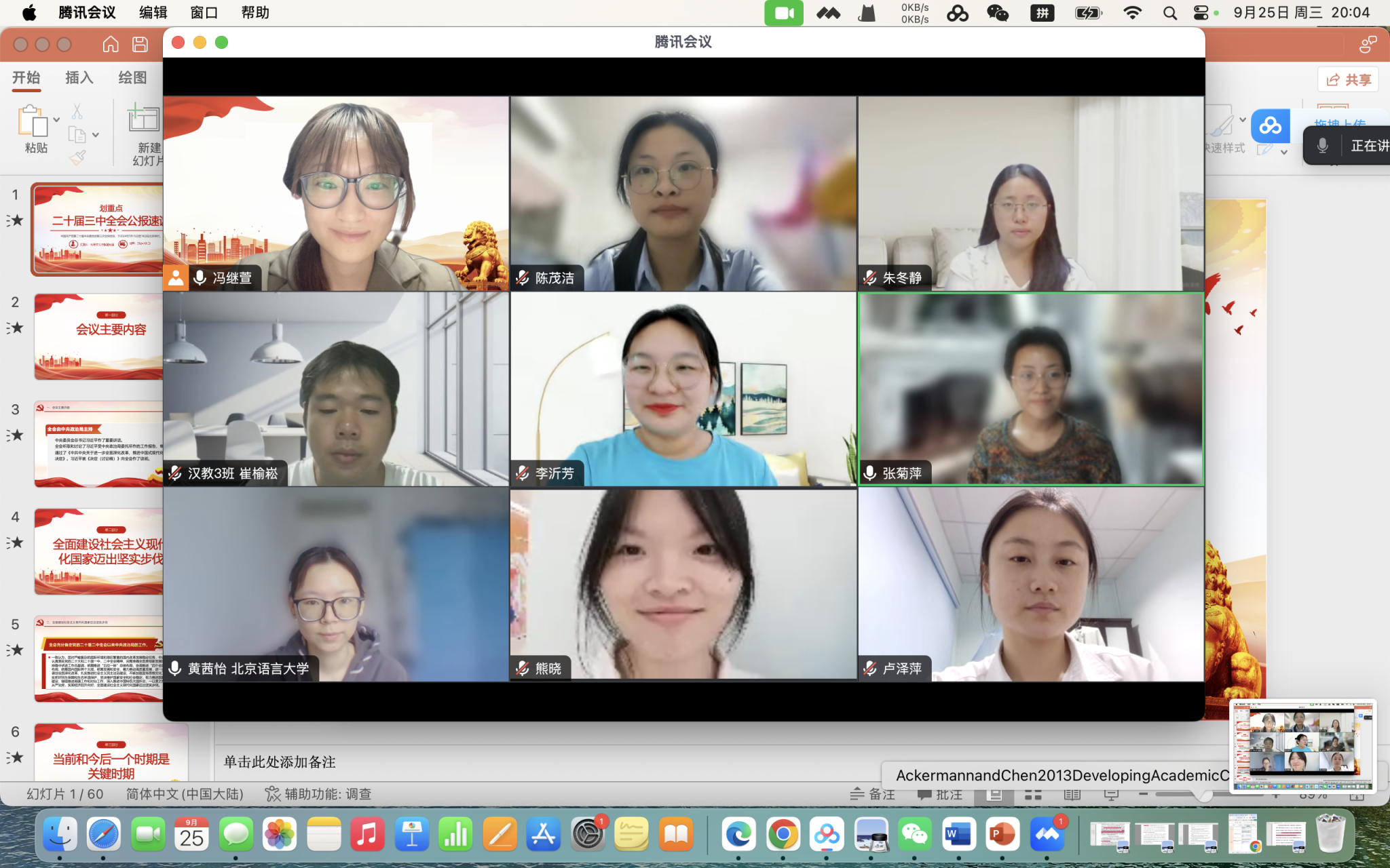 为了深入理解国家最新政策导向和发展规划,以及中国共产党第二十届中央委员会第三次全体会议的重要内容,应用中文学院第一团支部于9月26日举办了一场别开生面的线上专题学习活动。尽管汉语国际教育专业的研究生同学们遍布全球各地,但他们通过网络平台同步参与了这次意义非凡的学习。
