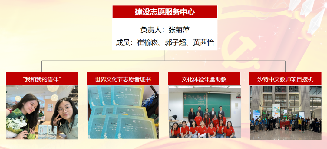 在服务青年方面,支部积极搭建志愿服务和社会实践平台,举办了“世界文化节”“文化体验日”“沙特中文教师项目接机”等志愿与实践活动,结成了中外语伴10余对,加强了学生的团队协作能力和对社会的责任感。特别值得一提的是,支部成员朱冬静、郭子超还连线采访了广西都安副县长甄刚,了解了乡村振兴的成果,并依托学校与学院的留学生资源,计划筹备外国留学生与都安中小学生的线上文化交流活动,努力实现中外交流与乡村振兴的相互促进。