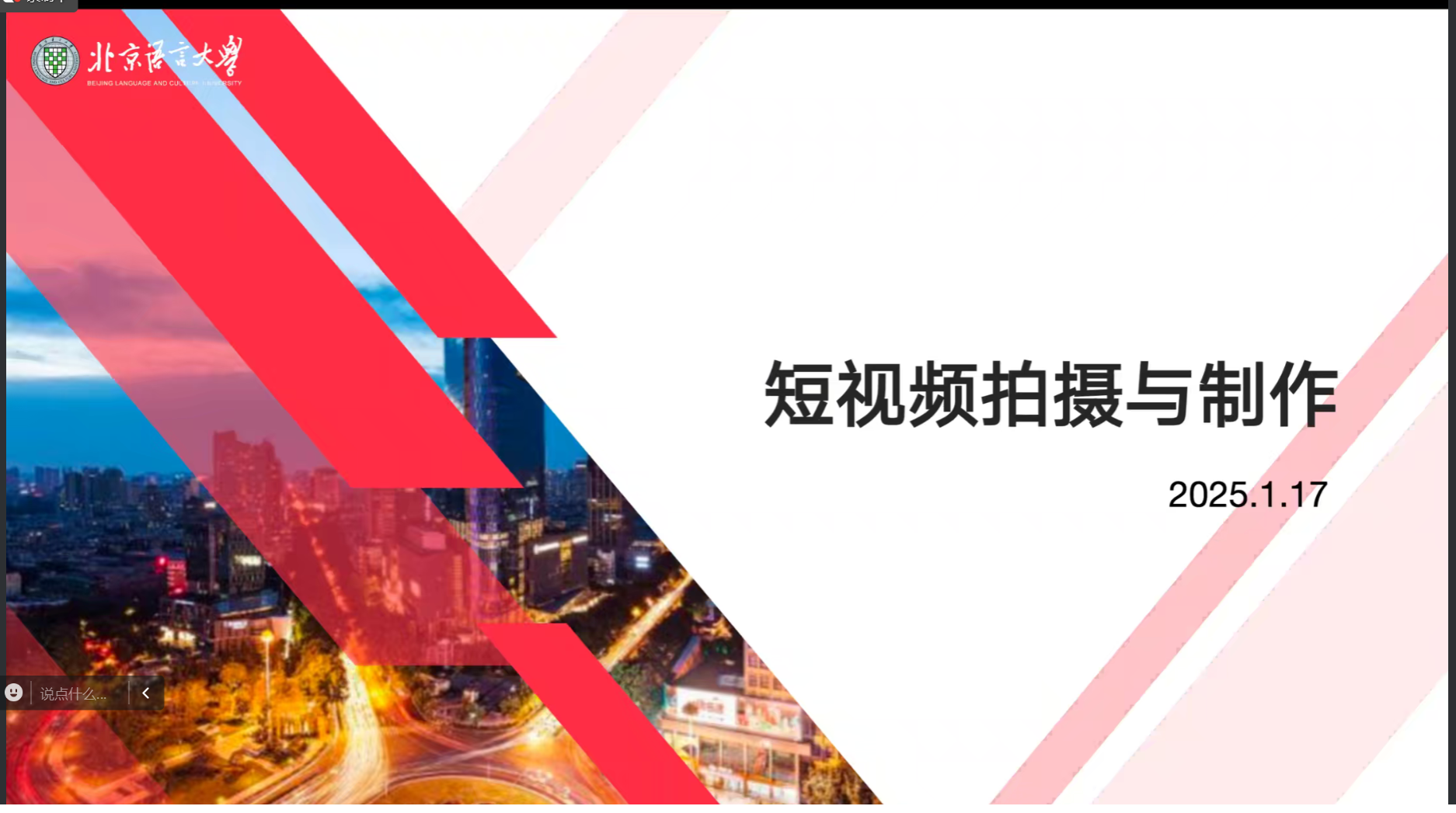 为进一步落实本年度就业工作安排,有效提升学生的专业职业技能,1月17日下午,应用中文学院顺利举办了2025年就业创业指导系列讲座第二场活动——“短视频的拍摄与制作”专题讲座。专业教育系主任吴霄岳老师、辅导员李晨露老师出席,讲座吸引了多名中外本研同学积极参与,收获满满。此次讲座由学院党委副书记白浩主持。