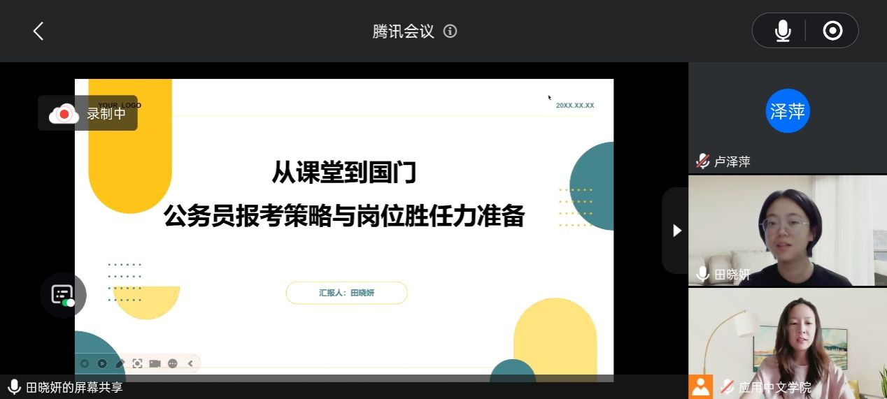 为深入贯彻党的二十大精神及习近平总书记关于做好高校毕业生就业工作的重要指示,全面落实党中央、国务院决策部署与教育部、市委市政府和学校相关要求,9月21日上午,应用中文学院线上举办研究生就业经验分享会。学院党委副书记白浩及数十名研究生参会,会议由辅导员李晨露主持。
