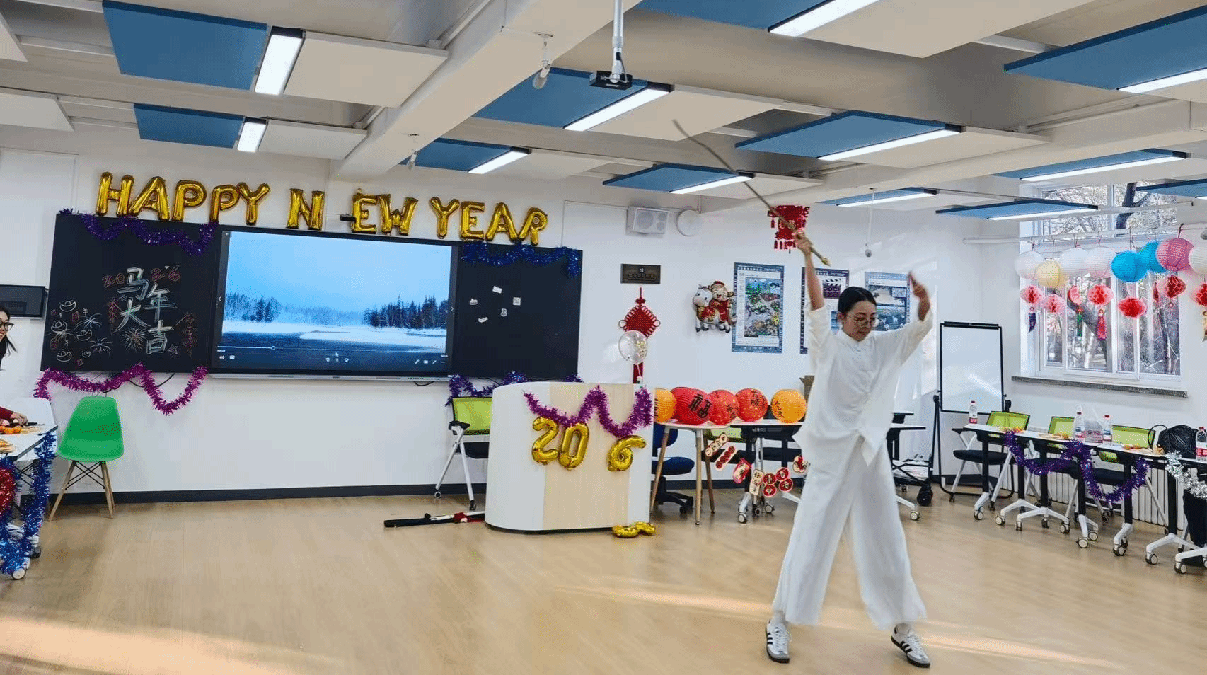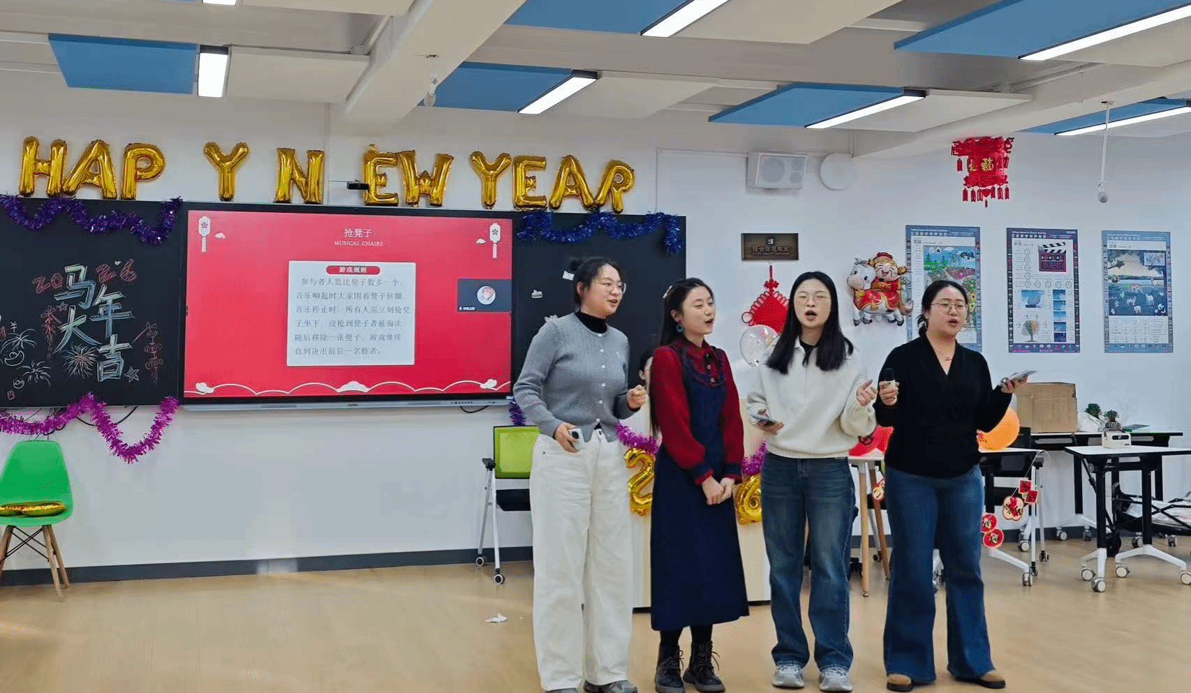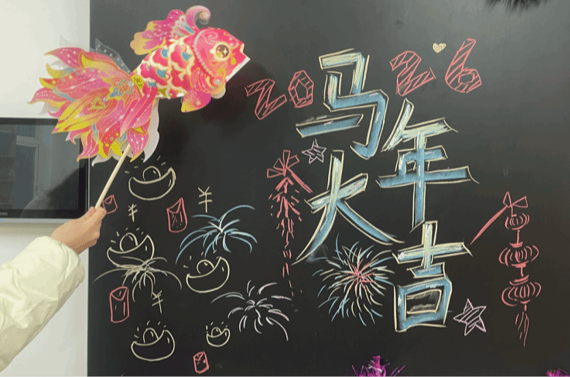 游戏环节包括猜歌名、emoji猜成语、爱你在心口难开和抢凳子等,师生积极参与。鱼灯制作环节增添了互动趣味。白浩老师现场为师生题写祝福。